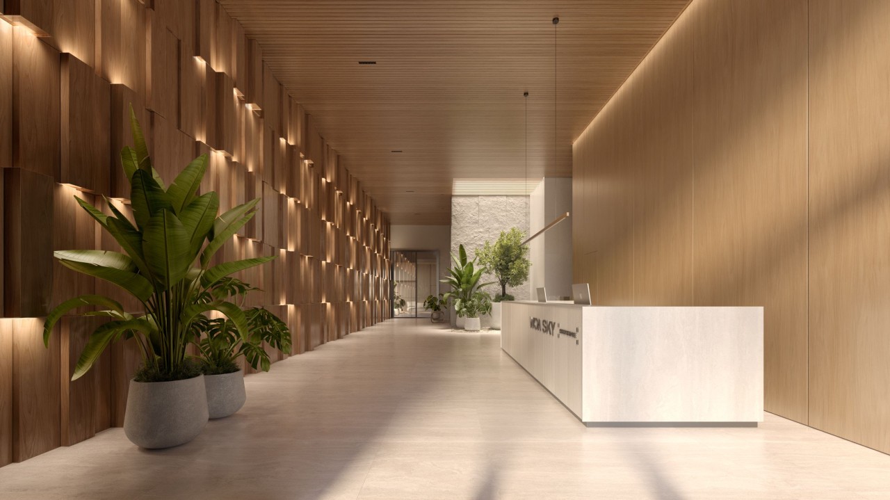 Cada projeto deve traduzir os valores e a personalidade da marca. No WOA SKY Corporate, hall com madeira, balcão de pedra e marcações verticais reforçam a identidade de sofisticação e inovação.