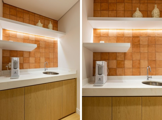 Nesta copa, as arquitetas do escritório Freijó Arquitetura optaram por instalar o backsplash (Roca Cerámica) da rodabanca até o teto, mantendo a unidade visual do projeto | Fotos: Mariana Camargo |