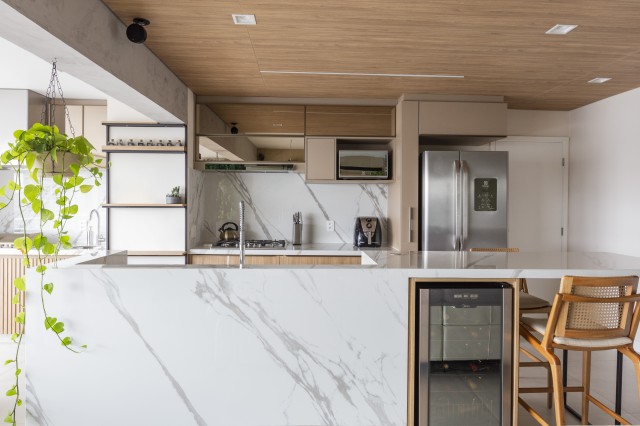 Quando todos os ambientes estão integrados, unidade é tudo. Nesta cozinha, as profissionais da Freijó Arquitetura apostaram no porcelanato para a bancada e o backsplash | Foto: Mariana Camargo |