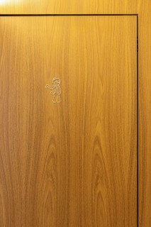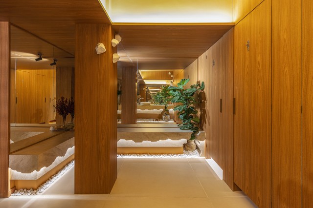 Nos 25 m² do Banheiro Raiz, ao adentrar, o aconchego da madeira envolve o ambiente com o MDF Freijó Trend, da Arauco, que reveste as quatro cabines, vigas e pilares existentes na estrutura do edifício histórico e no rebaixo do forro que se delineou como um pórtico e resultou nas alturas de pé-direito.
