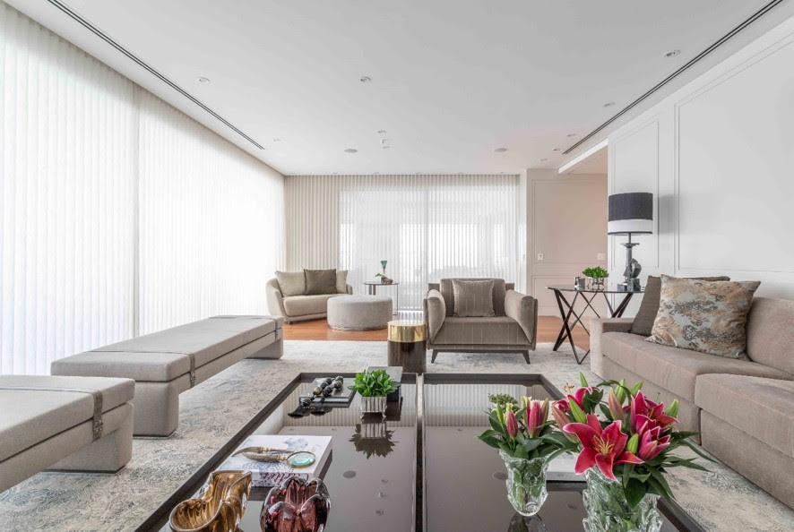 Nesse amplo living executado pela arquiteta Patricia Penna, os generosos sofás, aliados aos bancos e poltronas, criam uma atmosfera de acolhimento nas ocasiões que os moradores recepcionam seus convidados. A unidade está presente tanto no conjunto formado no layout, como na paleta que acompanha o décor | FOTO: Leandro Moraes
