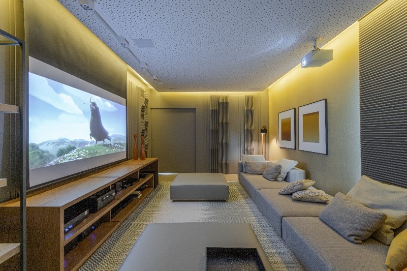 Para o projeto deste home theater, o rebaixo do teto acústico permitiu que as suas extremidades fossem iluminadas com as fitas de LED. Dessa maneira, a iluminação difusa deixa o ambiente ainda mais especial e relaxante, contando ainda com persianas automatizadas nas janelas que ajudam a evitar reflexos na tela da TV. Projeto: Patricia Penna Arquitetura & Design | FOTO: Leandro Moraes