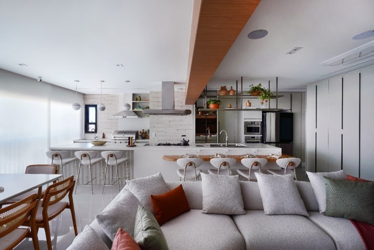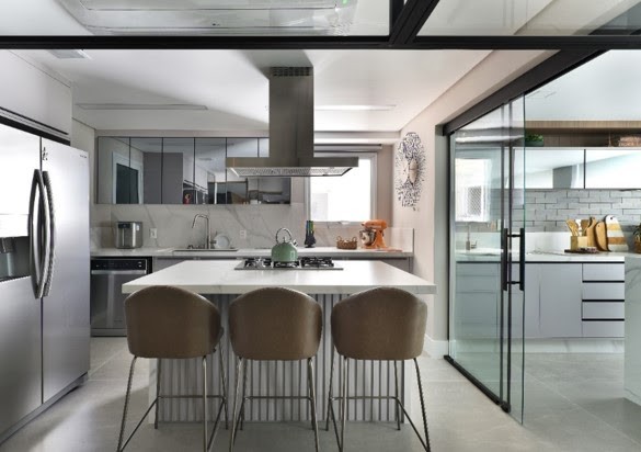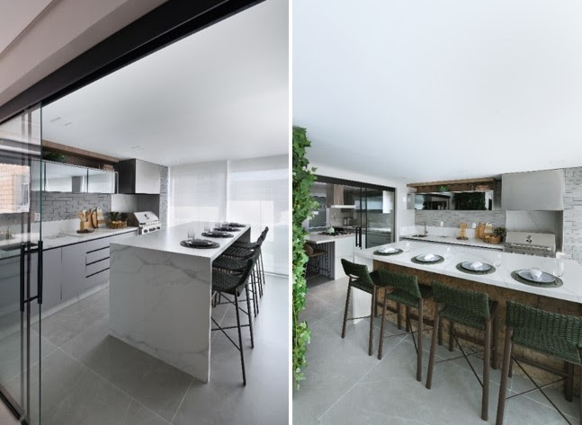 A cozinha é um dos pontos centrais de um projeto residencial, podendo ser integrada ou mesmo fechada para garantir sua privacidade e delimitação. Mas, e quando esse cômodo tão importante se une a outro de igual impacto: a área gourmet? Para a arquiteta Rosangela Pena, essa união traz grandes benefícios, principalmente quanto à otimização e a estrutura base da edificação, uma vez que toda tubulação de gás e instalações elétricas para o funcionamento dos eletrodomésticos utilizados nos dois ambientes estão próximos. "É inegável que esse planejamento em conjunto também coopera positivamente para o andamento da obra", afirma. Porém, esses não são os únicos atrativos de uma cozinha integrada com o gourmet, como revela a profissional: "Vejo também como interessante do ponto de vista estético, quando podemos unir bancadas, ilhas, mesas de jantar, a marcenaria e o revestimento, tanto da parede, como do piso", observa a profissional. Protagonistas da área social Para famílias que adoram receber convidados e são adeptos da praticidade, ela reitera que essa união transforma a integração da área social, atribuindo à cozinha e varanda gourmet um destaque ímpar. "Gosto de atuar com uma composição interessante de materiais em que posso explorar seus atributos, ao mesmo tempo que exalam harmonia", indica Rosangela. |