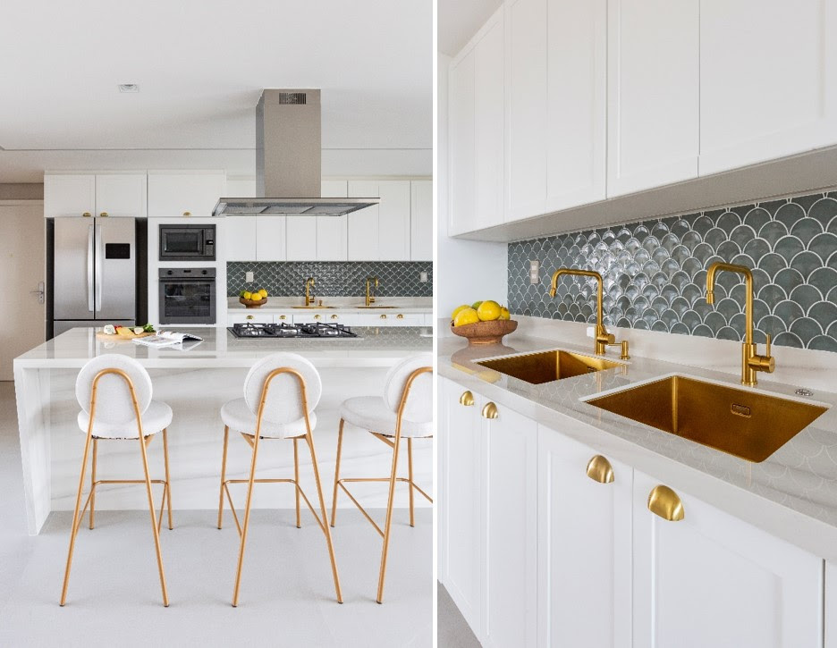 Cubas e metais de cozinha O dourado também protagoniza a cozinha com as decisões certas. Mari revela que ele se sobressai em cubas, torneiras e puxadores dos armários, transformando o décor em uma verdadeira experiência visual. "Nessas situações, gosto de trabalhar com pedras em cores em cores mais claras, como o branco", comenta. |