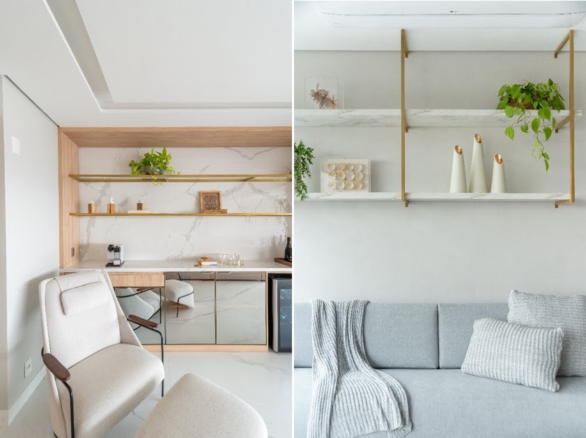 Nesses dois projetos, a arquiteta Mari Milani demonstra sua habilidade de incluir o dourado na marcenaria. À esquerda, a serralheria na cor é a base que envolve as prateleiras de vidro que compõem o cantinho do bar nessa varanda. À direita, se tornou a estrutura vertical para a instalação das prateleiras de MDF na sala de estar | FOTOS: Julia Herman |