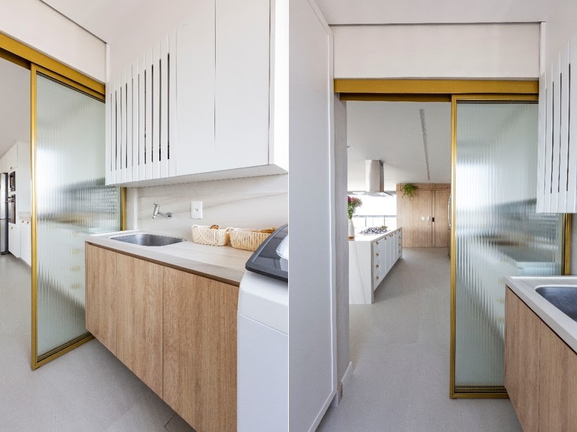 Nesse apartamento, a divisão entre a cozinha e a área de serviço quebrou a neutralidade com a divisória dourada. Para potencializar o efeito, a arquiteta Mari Milani elegeu o vidro boreal que desfoca a visão e ajuda a preservar o interior do ambiente | FOTOS: Mariana Camargo |
