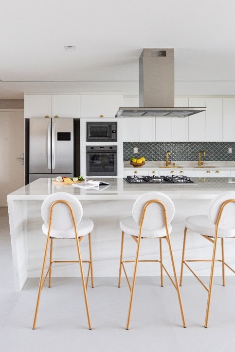 Trabalhando com longas banquetas para servir de apoio para a ilha da cozinha, a estrutura longeva das peças deixa em evidência todo o brilho do dourado. Para complementar a composição, tanto a bancada como o estofamento dos bancos e o piso escolhido para revestir a cozinha são brancos, o que torna o dourado a grande vedete do projeto assinado pela arquiteta Mari Milani | FOTOS: Mariana Camargo |