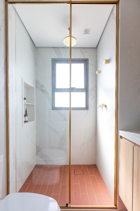Com as esquadrias também em dourado, que ocupam, do piso ao teto, nesse outro box executado pela arquiteta Mari Milani, os metais completam a atmosfera | FOTO: Mariana Camargo |