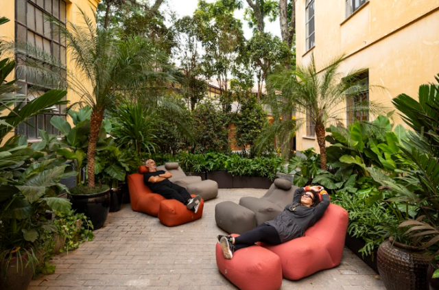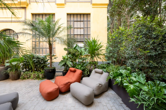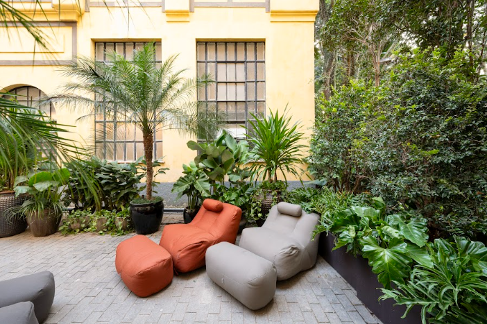 Para que as pessoas possam relaxar e se esparramar com conforto, o jardim reúne poltronas e chaises (Hio Decor), feitas de espuma maciça e tecidos outdoor de última geração, que se moldam ao corpo de quem chega ao jardim | Foto: Renato Navarro |