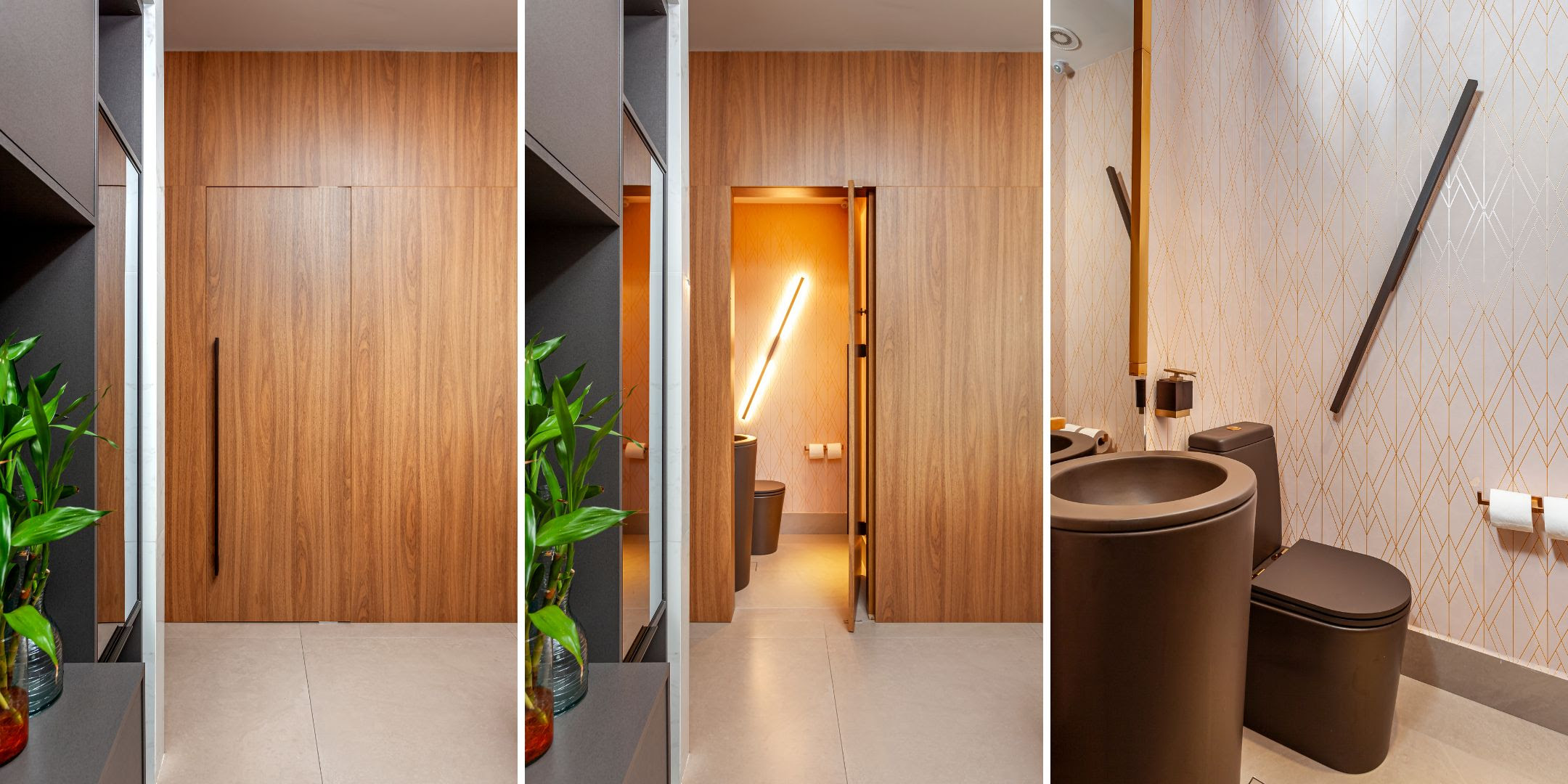 Atrás de um painel ripado que se camufla na sala à marcenaria da sala, surge um lavabo onde metais dourados,