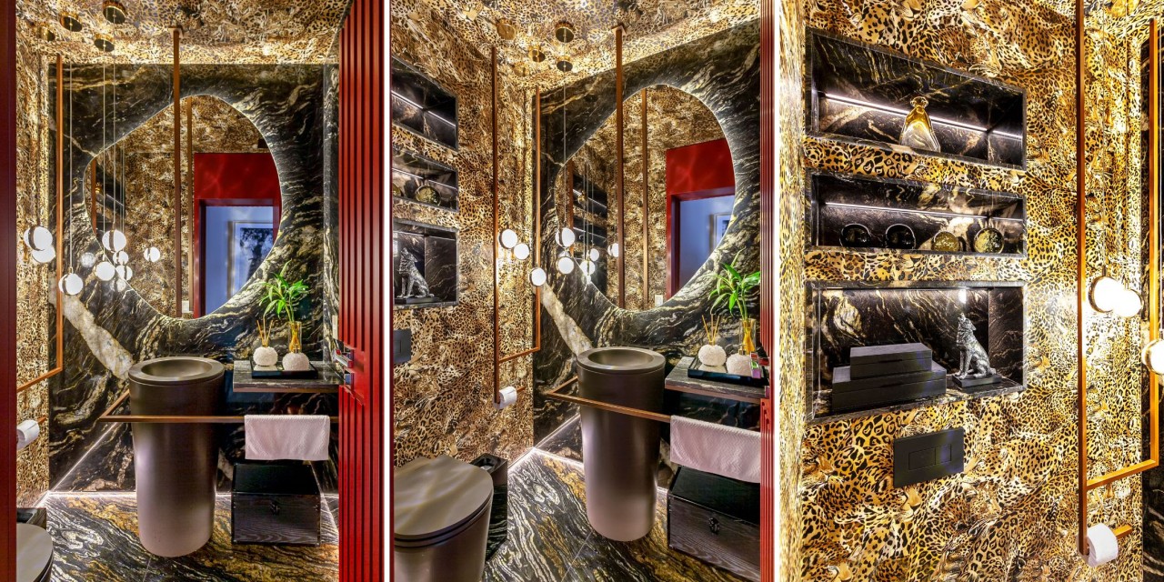 Fascínio, ousadia e contraste. É com esse trio que o projeto se destaca ao combinar superfícies espelhadas com o dramatismo de um papel de parede em animal print. "Mesmo com as dimensões reduzidas, típicas de um lavabo, optamos por uma cuba de piso em louça da Deca e uma torneira de teto para maximizar o espaço e causar impacto", explica Cristiane. Os pendentes iluminam suavemente, enquanto o revestimento marmorizado presente no piso, na bancada, nos nichos e na parede onde está o espelho orgânico entrega continuidade e profundidade visual.