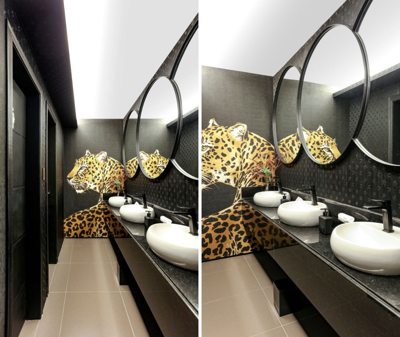 Superfícies espelhadas, papel de parede animal print e iluminação cênica propiciam um jogo de reflexos