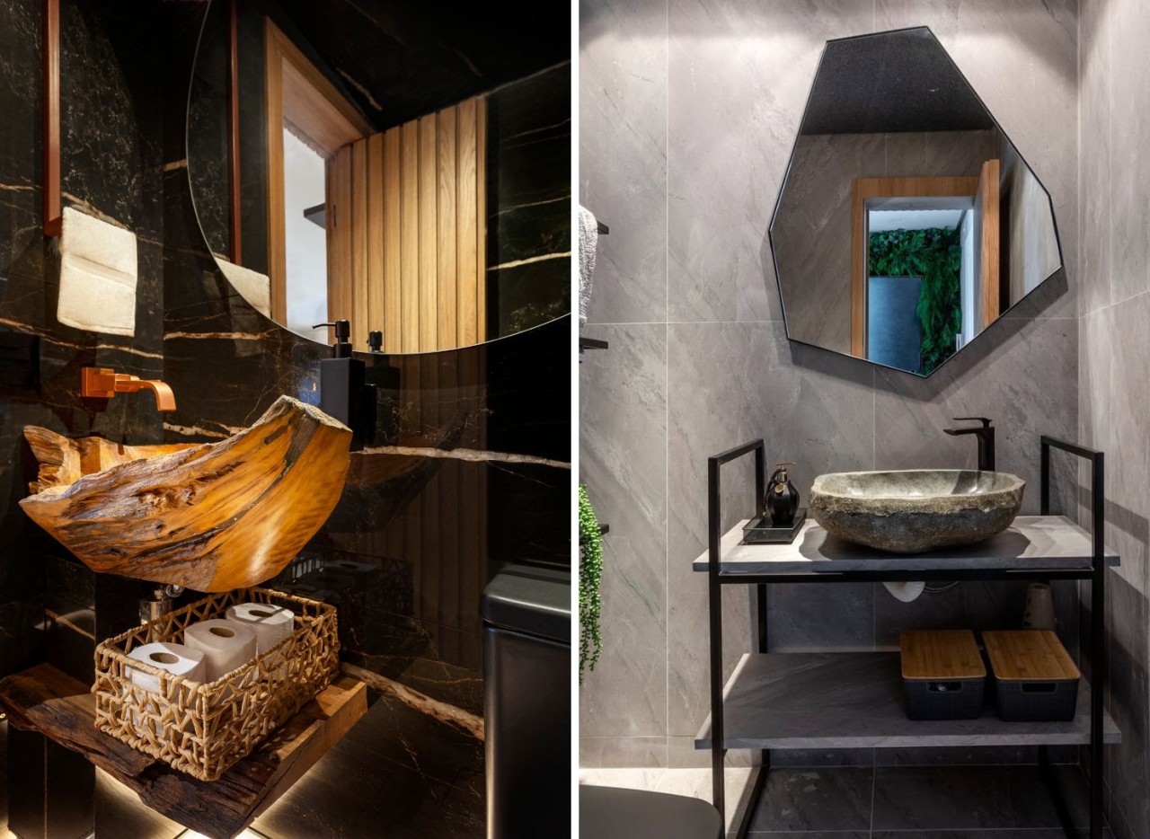 Entre os elementos que transformam um lavabo em ponto de destaque, as cubas são, sem dúvida, peças-chave. Em dois projetos distintos, Cristiane apostou em materiais naturais e volumetrias expressivas para surpreender.