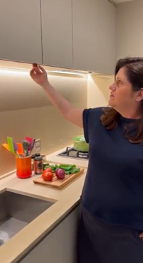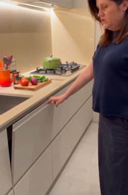 A arquiteta Claudia Paiva demonstra os discretos puxadores cava realizados nos armários. Nos gavetões inferiores – em especial o localizado perto da cuba, ela e a sócia, Vanessa Paiva, escolheram uma porta basculante | Projeto: Paiva e Passarini Arquitetura | Foto: Xavier Neto |