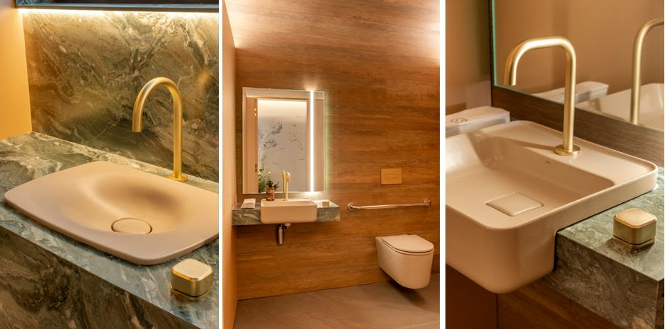 Segundo os arquitetos, os revestimentos que imitam pedras naturais, como quartzitos e arenitos, estão em alta justamente por despertarem uma conexão direta com o orgânico e o atemporal. As cerâmicas com veios marcados ou em formatos grandes também ganham força por permitirem continuidade visual e menor quantidade de rejuntes, o que reitera a ideia de fluidez e sofisticação. "Com esse movimento, os polidos e brilhantes perderam espaço", constata Mariana. "A estética muito fria e artificial, com superfícies reflexivas, tem sido deixada de lado em banheiros que propõem mais acolhimento e introspecção. Estamos vivendo um momento em que o toque importa tanto quanto a aparência", afirma o arquiteto, que reforça ainda que as cores neutras, variações de bege, areia, terracota e verde seco estão em evidência. Também estão em alta as cubas sobrepostas com recortes embutidos que oferecem leveza visual e praticidade no uso. "A louça sanitária é um material durável, colorido e extremamente higiênico. Além disso, os novos modelos trazem linhas contemporâneas, com acessórios integrados, o que a torna ainda mais versátil", comentam. |