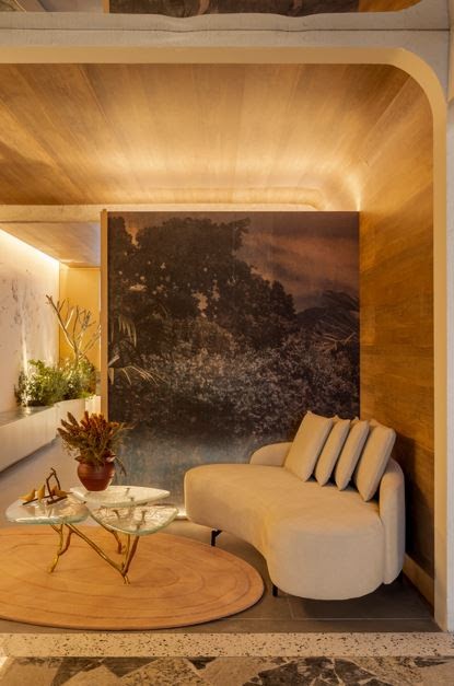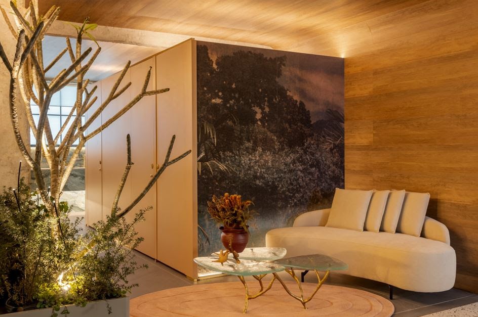 Outra aposta dos profissionais é o uso de uma chapa autoportante de resina, da Fórmica, com um centímetro de espessura. Desenvolvido especialmente para áreas molhadas, o material une leveza, sustentabilidade e praticidade de instalação. "Essa tecnologia elimina a necessidade de integrar marcenaria e marmoraria, resultando em uma produção mais rápida e econômica. É um material com potencial imenso de aplicação, especialmente se pensarmos em reformas mais ágeis e sustentáveis", reforça Alexandre. Sustentabilidade em alta Materiais sustentáveis também ganham protagonismo, como os laminados com certificação ecológica, revestimentos de bambu e cortiça, além de pastilhas de vidro reciclado. O ambiente Natureza em Essência ainda destaca o uso de painéis modulares, de rápida instalação, que reduzem desperdícios na obra. O mobiliário, por sua vez, valoriza o design brasileiro, feito por artistas e marceneiros locais, reforçando o desejo de cultura e exclusividade. "Há uma intenção muito clara de valorizar o que é feito no Brasil, com materiais duráveis, de menor impacto ambiental e estética contemporânea. A brasilidade aparece não como temática folclórica, mas como design de alto nível, conectado à nossa identidade e ao planeta", pontua Mariana. |