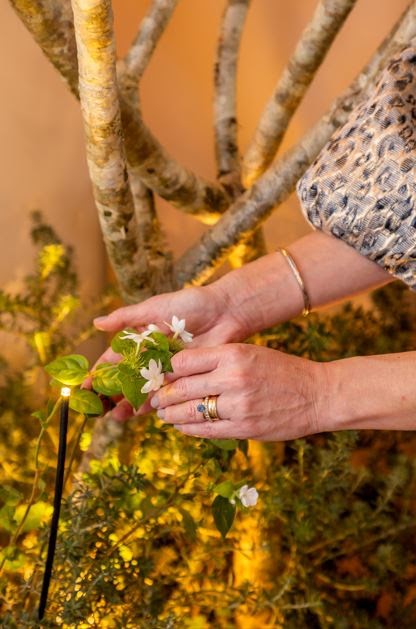 O jardim recebe flores de jasmins e alecrim que despertam o visual e o olfativo no ambiente da CASACOR SP | Projeto Meneghisso & Pasquotto Arquitetura | Foto: Rafael Renzo |