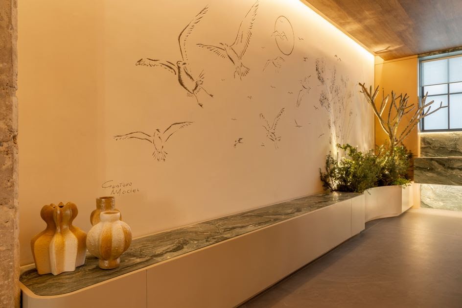 Parede esculpida com uma talhadeira pelo artista soteropolitano Gustavo Maciel | Projeto Meneghisso & Pasquotto Arquitetura | Foto: Rafael Renzo |