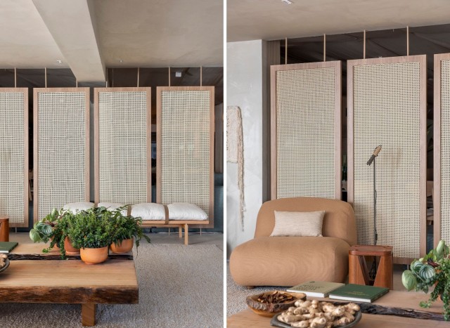 No espaço executado pela arquiteta Isabella Nalon, o biombo foi realçado pela naturalidade do acabamento palhinha | Fotos: Rafael Renzo