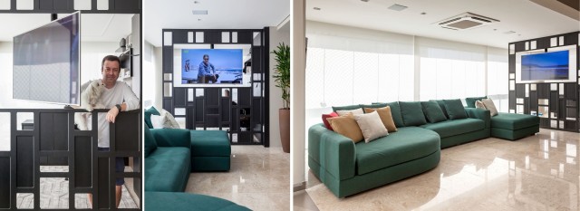 Por aqui, a arquiteta Cristiane Schiavoni planejou uma divisória arrojada: além da assimetria do seu desenho vazado, ela acopla o suporte giratório da TV que tanto pode atender o morador, enquanto exerce suas atividades profissionais, como o living | Foto: Carlos Piratininga