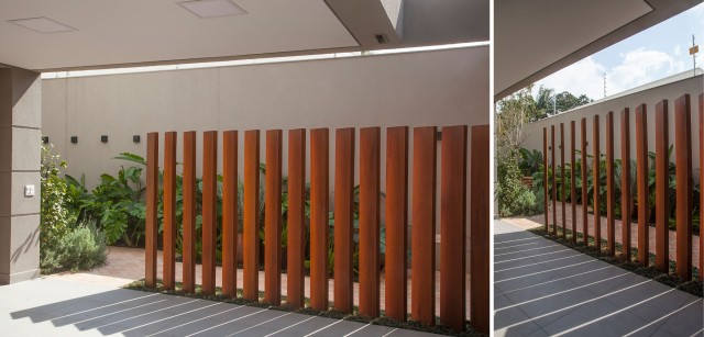 No projeto de uma residência, a arquiteta Isabella Nalon trabalhou o brise fixo em aço corten para conduzir o caminho na lateral. A definição do material levou em conta sua resistência – produzido em liga de aço que forma uma camada protetora de ferrugem, elimina a necessidade de pintura ou selantes e mantendo a integridade estrutural.