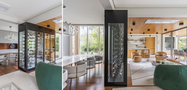 Bem-vinda entre a sala de jantar e estar, a adega climatizada trazida pela arquiteta Ana Rozenblit também incorporou a cristaleira | Projeto Spaço Interior | Fotos: Kadu Lopes