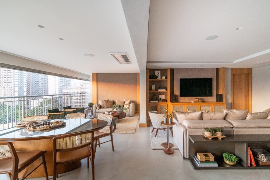 Logo nas primeiras reuniões de briefing, ela detectou os principais pilares indicados pelos moradores: ambientes aconchegantes e personalizados, além de uma área social sempre pronta para receber. "A partir daí, não há dúvidas: a concepção de ambientes integrados é uma resposta efetiva quando a intenção é ter um lar com a alegria de ter pessoas especiais sempre próximos", analisa a profissional. Ainda de acordo com ela, a eliminação das paredes que setorizaria os cômodos potencializou a fluidez no projeto de interiores, favorecendo a conexão entre as pessoas presentes – seja de quem habita o local ou quem é recepcionado.