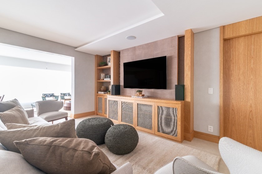 Revestido com camurça, no painel da TV a profissional criou um efeito com luz retro iluminada para não brigar com a luminosidade do equipamento. Nas portas do rack, o acabamento em palha sextavada tanto entrega a percepção de textura, como garante a ventilação necessária para os equipamentos | Projeto: Andrea Teixeira Arquitetura e Interiores | FOTO: Julia Herman