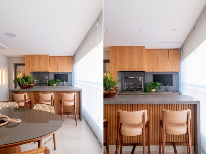 O carvalho natural, sem tingimento e em folhas naturais de madeira, foi responsável pela marcenaria que agrega o painel da TV, rack e a pequena estante localizada no recuo. Já na área gourmet, os detalhes nos revestimentos também fizeram toda a diferença: presente nos armários superiores e inferiores, a madeira proporcionou um clima caloroso que foi devidamente balanceado pelo cinza presente na ilha de apoio e na bancada onde está a churrasqueira.