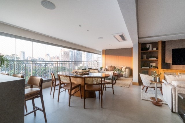 Na transformação que a arquiteta Andrea Teixeira realizou no imóvel adquirido na planta, a transição entre sala de estar e varanda, que ganhou uma área gourmet, está sempre pronta para as ocasiões entre os moradores e quando são os anfitriões