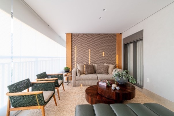 Como uma terceira parte da varanda, a arquiteta Andrea Teixeira idealizou um pequeno living, mais reservado, para conversas mais próximas e agraciadas pela inebriante luz natural advinda do fechamento de vidro. Pautada pela combinação entre sofisticação e sobriedade, a partir das variações de bege o verde se sobressaiu nas poltronas e no banco de couro.