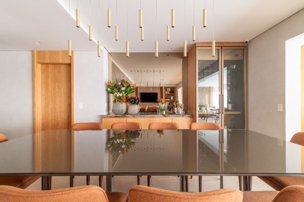 O charmoso pendente ilumina a sala de jantar através de suas saídas cilíndricas, enquanto o vidro na parede do bar enquadra o home theater através do reflexo | Projeto: Andrea Teixeira Arquitetura e Interiores | FOTO: Julia Herman