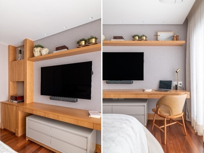 Com painel de TV que inclui equipamento de som, armários, estantes e um espaço para o home office, o dormitório se tornou um local aprazível e de fácil organização | Projeto: Andrea Teixeira Arquitetura e Interiores | FOTOS: Julia Herman
