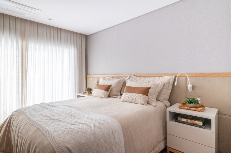 Faceando toda a parede, a cabeceira revestida com tecido é acompanhada pelos móveis laterais com um excelente espaço de armazenamento | Projeto: Andrea Teixeira Arquitetura e Interiores | FOTO: Julia Herman