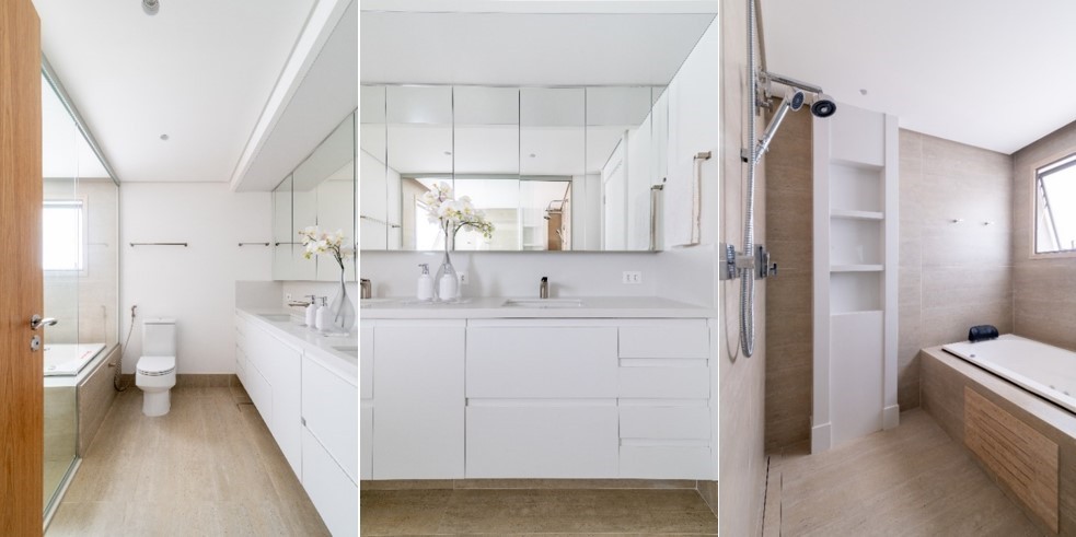 Para complementar a privacidade e os momentos a dois, a sala de banho agrega todos os recursos que estimulam a desconexão com o mundo exterior e o prazer do autocuidado. Na seleção, a hidromassagem é respaldada pelo box de vidro e o combo que preserva a individualidade: dois chuveiros e cubas na bancada.