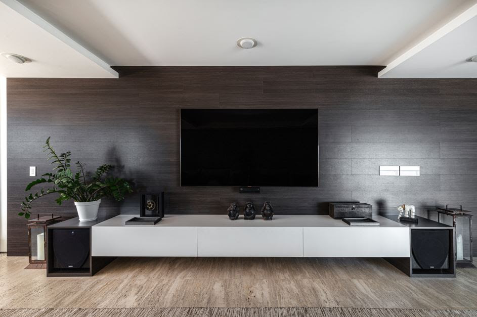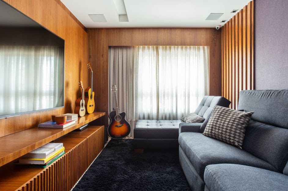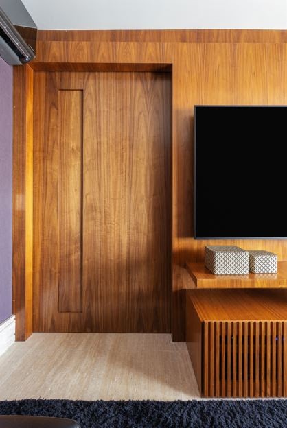 Já no quesito acústico, algumas simples deliberações fazem grande diferença na sala. Tapetes, cortinas e estofados ajudam a absorver o som, reduzir o eco e melhorar a experiência sonora. Em casos específicos, Paula explica que é possível buscar produtos que auxiliam na eliminação dos ruídos externos, em geral, pela localização do imóvel. Tecnologia a favor do bem-estar O home theater tradicional ainda é uma escolha valorizada por quem deseja uma experiência mais impactante. Porém, a dupla observa que as preferências estão mudando com a evolução dos equipamentos de áudio e vídeo. "Hoje vemos cada vez mais o uso de soundbars, caixas Bluetooth e sistemas de som mais discretos, porém de alta qualidade. O importante é que o projeto de marcenaria preveja locais adequados para acomodar os aparelhos, com ventilação suficiente para evitar superaquecimento e espaços para esconder os fios, deixando tudo mais organizado e esteticamente limpo", aconselham. |