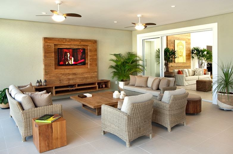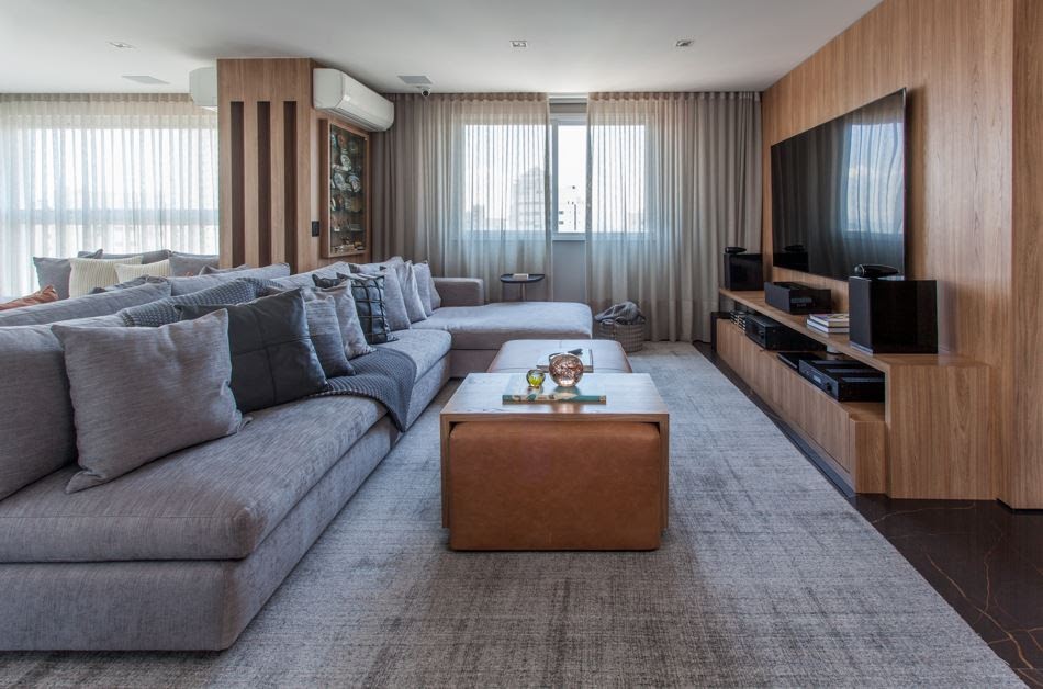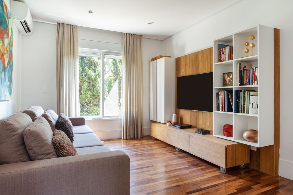 Além da tela, é preciso considerar as proporções dos móveis e o espaço de circulação. A dupla do escritório Dantas & Passos Arquitetura pontua que 60 cm se constitui no vão mínimo entre o sofá e a mesa de centro ou rack | Foto: Eduardo Pozella |