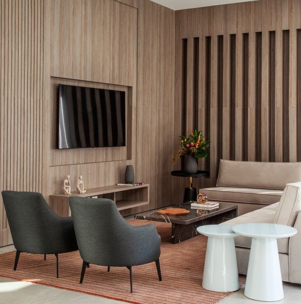 Uma parede com textura, madeira ripada ou papel de parede pode funcionar como moldura visual para a TV, valorizando a decoração | Projeto Dantas & Passos Arquitetura | Foto: Divulgação |