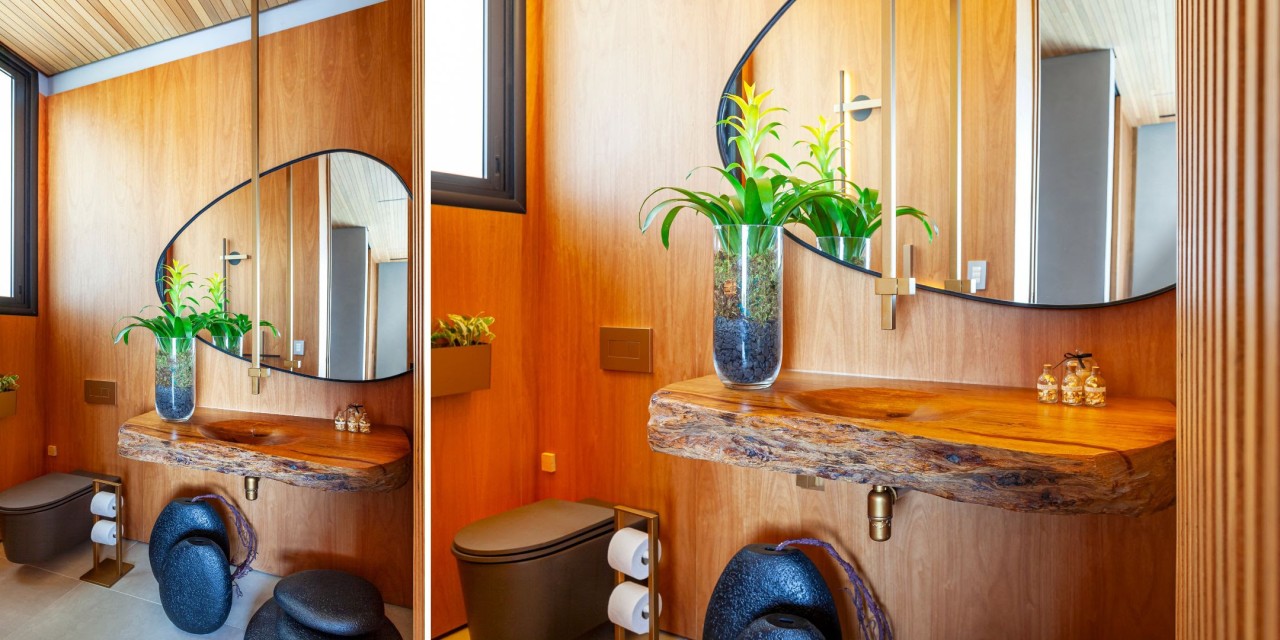O lavabo surpreende pela escolha de materiais e detalhes funcionais, como bancada de tronco esculpido, espelho orgânico e torneira suspensa que desce do teto | Projeto de Interiores: Cristiane Schiavoni Arquitetura | Fotos: Carlos Piratininga |