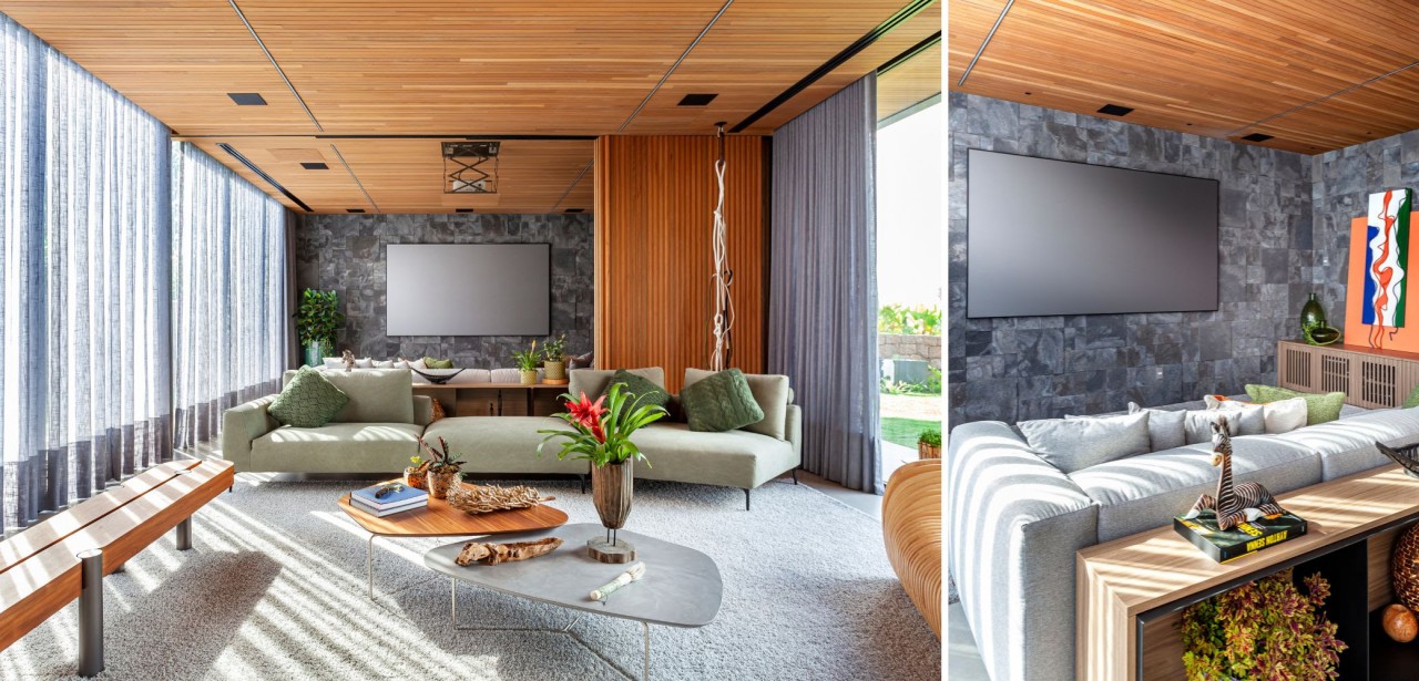 Fechado por portas de correr, o home theater se abre ou se isola conforme a decisão dos moradores. Para ofertar comodidade visual e acústica, a profissional detalha que as paredes receberam a aplicação de um revestimento cimentício que lembra pedra e tecidos. "Sem contar que a madeira se soma com o seu papel como isolante sonoro", enumera. |