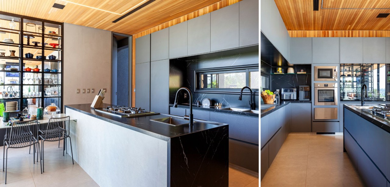 A cozinha ganhou marcenaria da Bontempo no acabamento Laminatto Galassia e metais pretos que reforçam a identidade contemporânea. A ilha central abriga o cooktop, a cuba e a coifa de exaustão embutida na própria bancada e que só aparece quando acionada. |