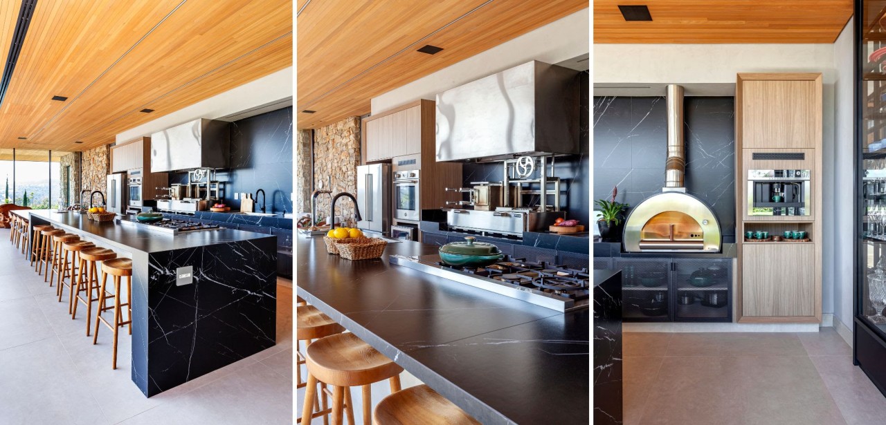 Com espaçosa bancada ilha de 4 m, a área gourmet concretiza todos os sonhos: desde a pizza até o churrasco, passando por outros pratos cuja cocção pode acontecer no cooktop ou no forno elétrico | Projeto de Interiores: Cristiane Schiavoni Arquitetura | Fotos: Carlos Piratininga |