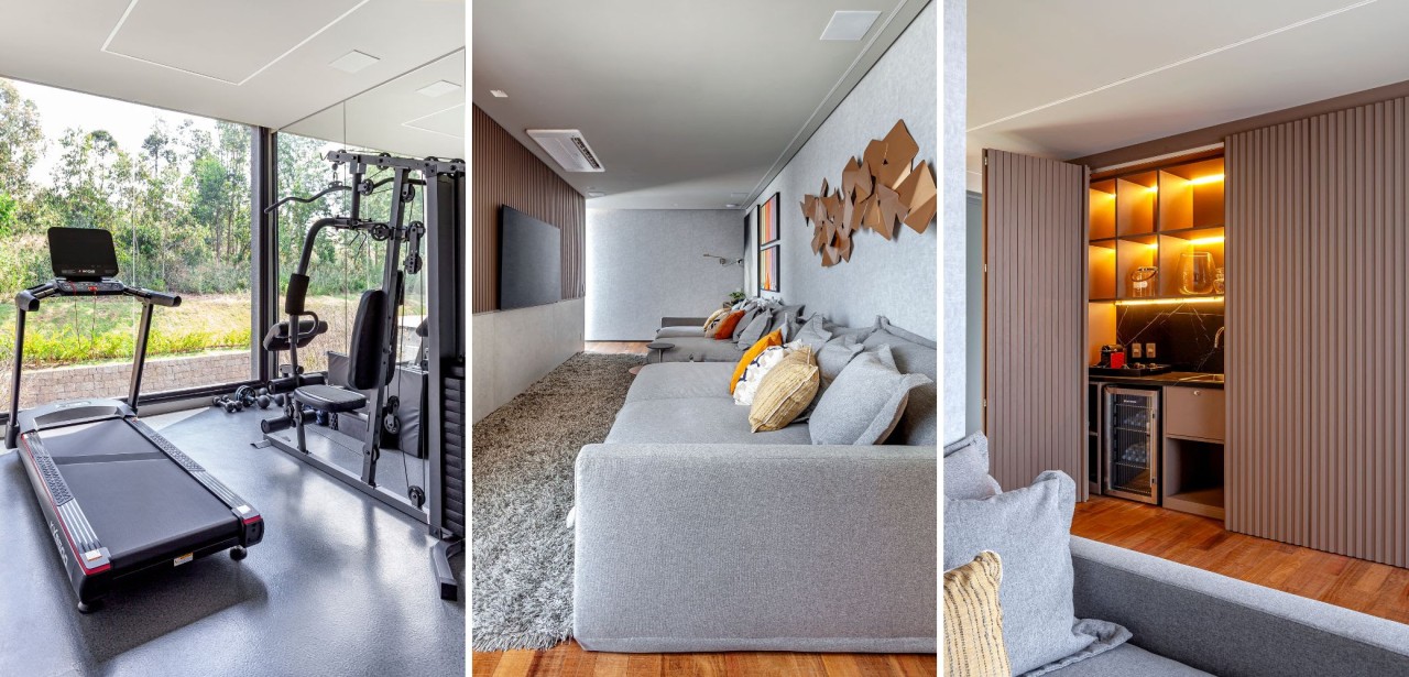 No andar superior, a sala íntima funciona como um ponto de encontro cotidiano da família. O sofá tipo chaise convida ao descanso e ao convívio, enquanto a academia atende muito mais do que a prática de atividade física: com vista para o jardim, recebeu painel ripado que esconde frigobar, cuba e máquina de café, garantindo praticidade sem a necessidade de descer até a cozinha. Esse detalhe valoriza a rotina e oferece independência no uso dos ambientes. |