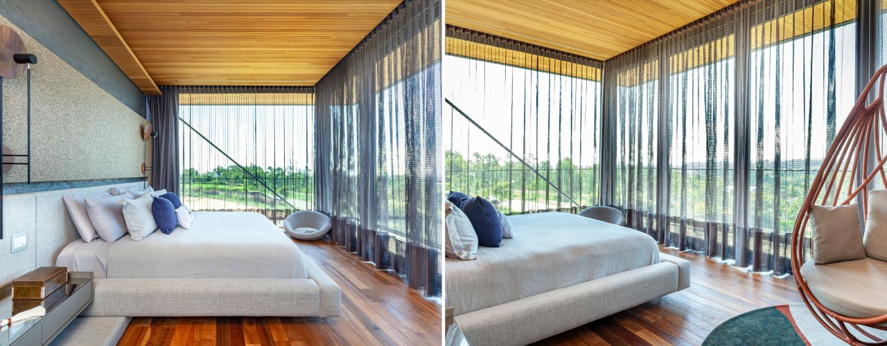 A suíte master concebida pela arquiteta Cristiane Schiavoni se destaca pela devoção à permanência e a percepção de que quem a usufrui também se torna parte da natureza por conta do fechamento de vidro. O balanço suspenso é um afago e se alinha com um conselho eternizado por Sócrates: "Cuidado com o vazio de uma vida ocupada demais". O ócio também faz parte de uma vida bem vivida | Fotos: Carlos Piratininga |