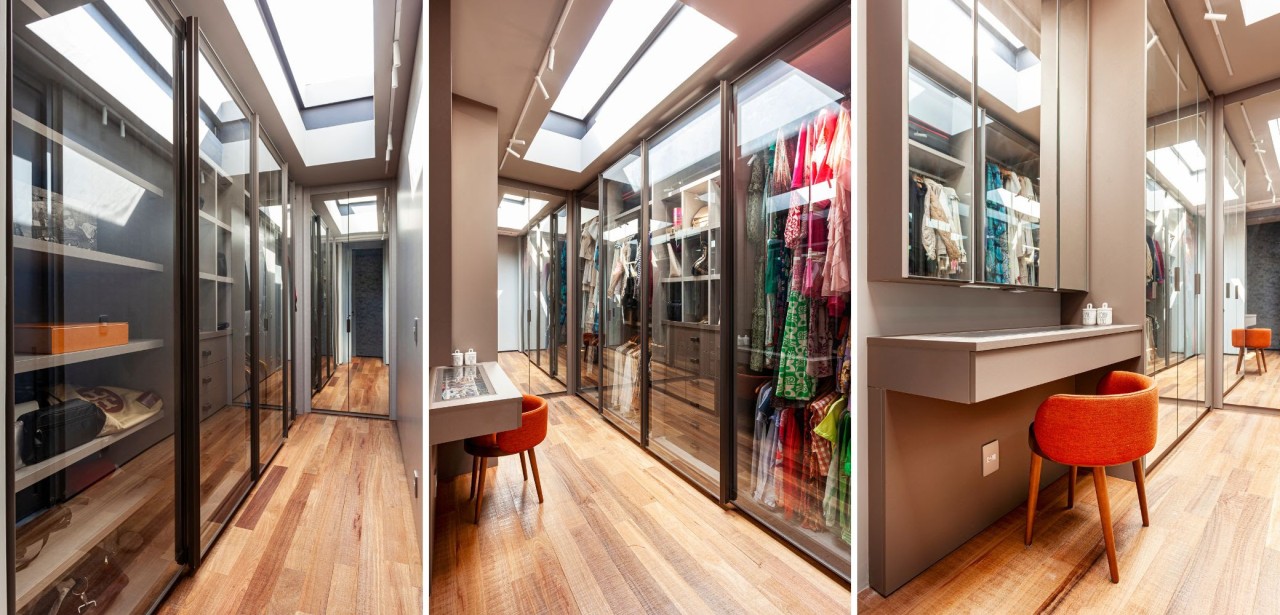 O closet do casal se sobressai pelo acesso confortável aos armários e prateleiras bem distribuídos, além do banheiro e a penteadeira suspensa | Projeto de Interiores: Cristiane Schiavoni Arquitetura | Fotos: Carlos Piratininga |