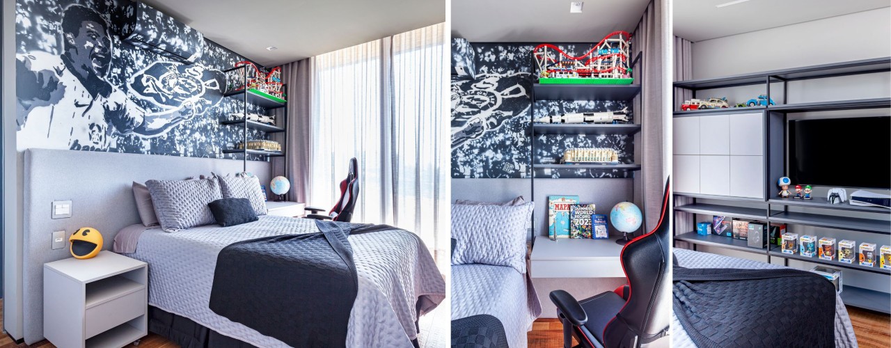 O quarto do primogênito reflete sua paixão pelo Corinthians com papel de parede temático e paleta preto