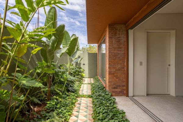 Legenda da Capa: Nesta residência, localizada em São José do Rio Preto e projetada pelas arquitetas Claudia Passarini e Vanessa Paiva, a lateral da residência conecta a frente aos fundos da casa. Os tijolinhos estruturam o caminho junto com o paisagismo no entorno da edificação | Projeto: Paiva e Passarini Arquitetura | Foto: Vitor Martins