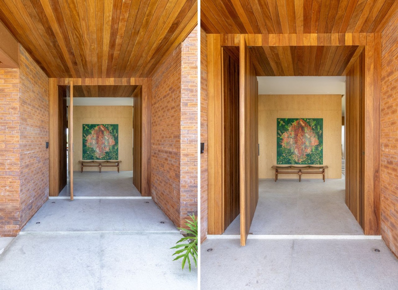 Para completar, a sinergia com a madeira que recobre o teto e acompanha a ampla porta pivotante| Projeto Paiva