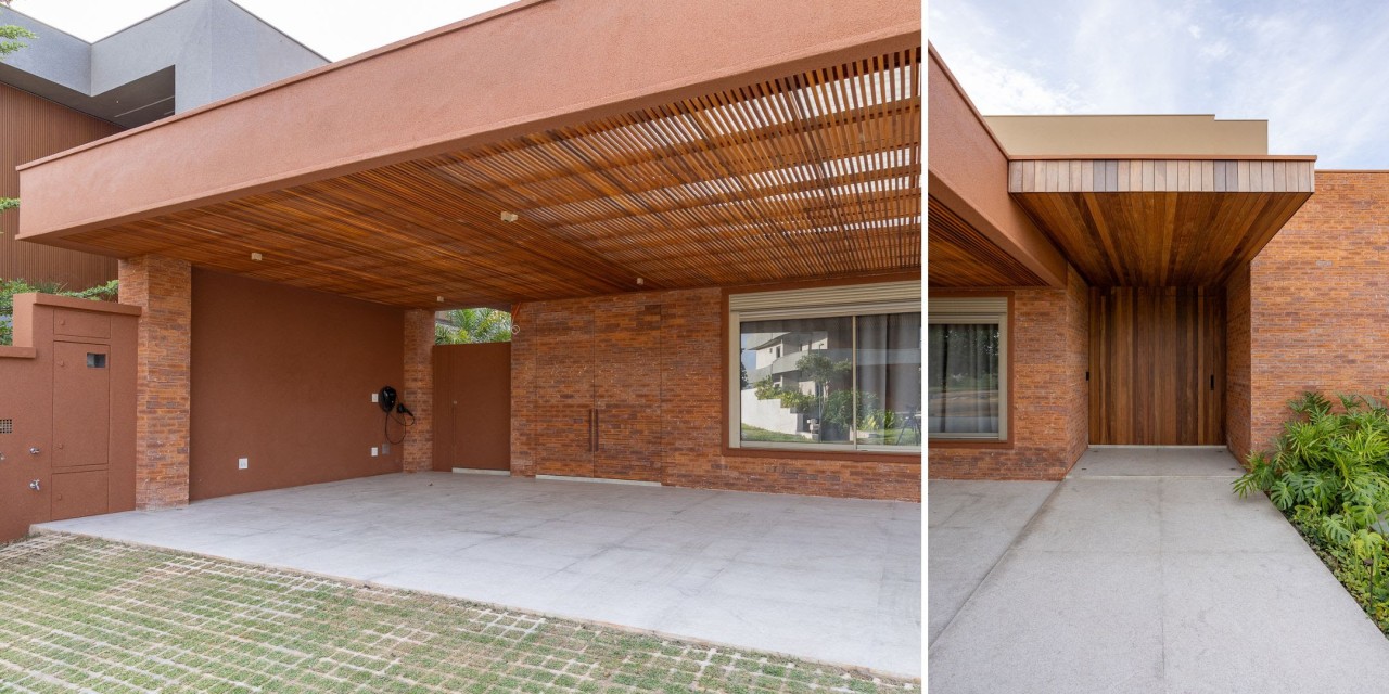 A fachada da residência se destaca pelo revestimento completo em tijolinho que transmite imponência e unidade visual, mostrando como o material pode ser rústico e sofisticado ao mesmo tempo | Projeto Paiva e Passarini Arquitetura | Fotos: Vitor Martins