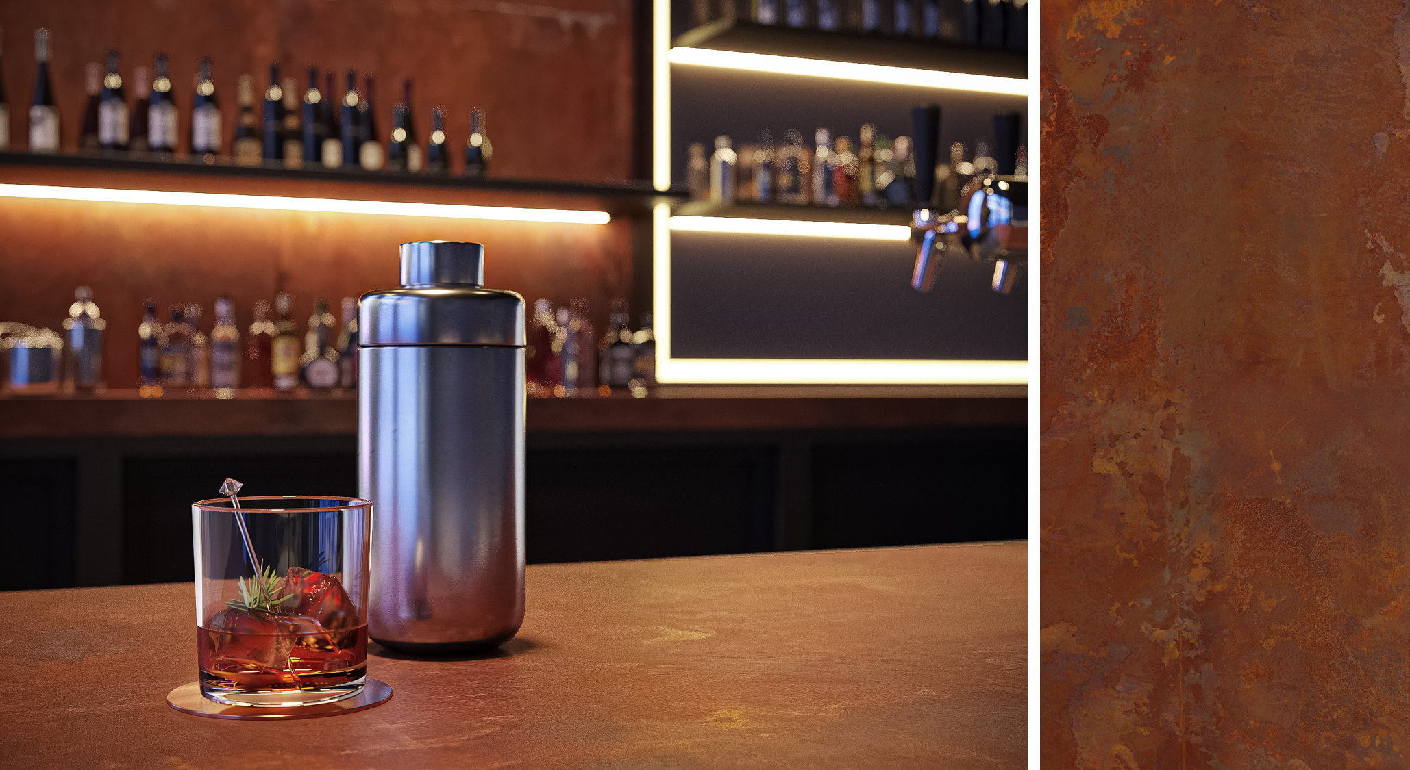 O poderio tecnológico Grupo LAMOSA no Brasil é capaz de reproduzir com fidelidade inúmeros materiais, como o efeito do efeito do aço corten. Um ícone dos anos 1930, ele foi inspiração para a série Fire, da Roca Cerámica, trazendo o aspecto enferrujado, os tons avermelhados e o caráter industrial. No Superformato 120 x 250 cm, reproduz com perfeição todas essas peculiaridades e reações ao tempo, imprimindo ao porcelanato ares de desgaste natural | Foto: Divulgação Roca Cerámica |